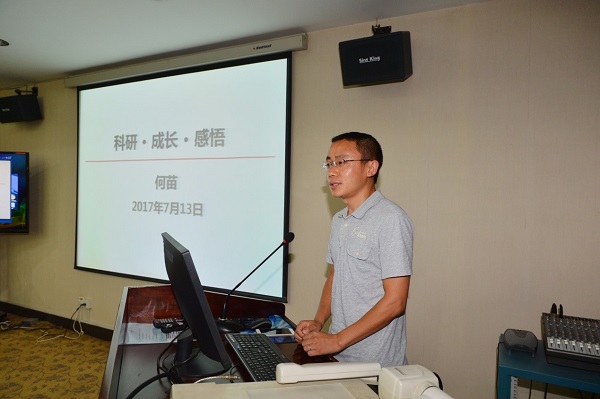 实验物理中心研究员何苗作为优秀青年职工代表作了《科研-成长-感悟》的报告,他结合自己在大亚湾中微子实验组中开展的科研工作,分享了成长道路上的经验心得,鼓励新职工抓住转变的机遇,提出年轻人要丰富业余生活,积极参加文体活动,在活动中建立友谊,提高沟通和团队协作能力。