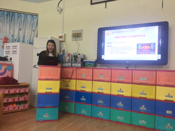 在会议开始,团支部书记贾晨为青年团员们讲解了十九大会议精神。并组织大家交流讨论。青年团员结合自己对十九大的认识针对自己关注的话题简单发表了看法。他们说:“我们的国家在与时俱进,作为青年一代的我们也要与时俱进,要一点一点的进步,慢慢积累经验,提升自己提升。”“在实际工作中,我们要明确我们的工作职责,坚持以孩子为中心,不忘初心。”