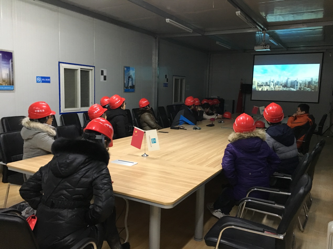 中心成员在施工调度会议室观看了中国尊建筑及建设过程宣传片。中国尊位于北京市商务中心区核心区,用地面积11478平方米,总高度528米,地上108层,地下7层,由中信和业投资有限公司承担建设。该项目于2013年7月开工建设,2017年8月实现结构封顶,预计2018年底全面竣工投入使用,届时将成为首都新地标,北京市第一高楼。中国尊项目采用世界房建施工领域施工平面面积最大、承载力最强、首个自带两台大型塔机的智能化超高层建筑施工集成平台;也是国内第一个由业主主导,采用EPC一体化管理模式的特大型开发工程。中国尊在施工过程中,利用PW协同平台,实现从业主、设计、监理、总包、各专业分包的全面协同;深入应用BIM技术,实现工程的全关联单位共构、全过程模拟和全生命周期应用。该项目建设速度是一般超高层建筑的1.4倍。