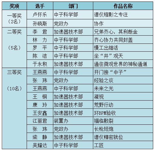 5月16日,散裂中子源第六届摄影征集活动经过匿名投票评选,各类奖项纷纷揭晓。中子科学部卢怀乐的作品《谱仪缩影之专注》和党政办孙晓斯的作品《协作》获得照片类一等奖,党政办张玮的作品《散裂奋斗之歌》获得视频类一等奖。活动另外评出照片类二等奖5名、三等奖10名。