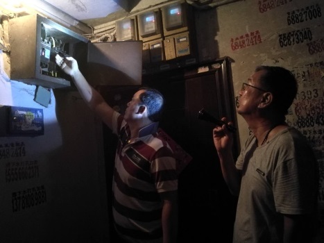 8月4日晚电工进行住宅楼用电高峰负荷夜间巡查