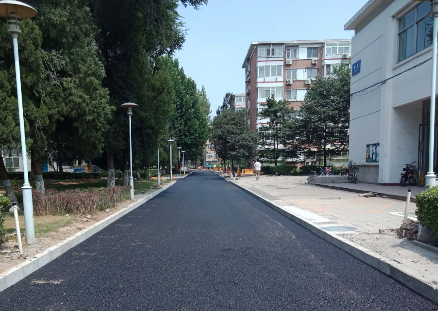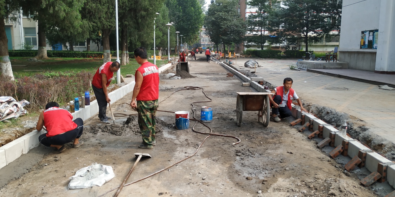 为了保障良好的办公秩序,不影响孩子们正常上学,行政处选择在高温假期间进行食堂到幼儿园道路的底层沥青铺设工作。每日都安排了值班工程师值守,并协调各方面工作。室外工地上温度高、环境差,行政处职工头顶烈日,脚踏高温,工作服被汗湿了一遍又一遍,每个人也毫无怨言,这已经成了他们的职业习惯。终于在高温假结束前,顺利完成了道路拆除、路床整理、石灰粉煤灰铺设、路缘石铺设、粗粒混凝土铺设等各道工序,实现了预期目标。