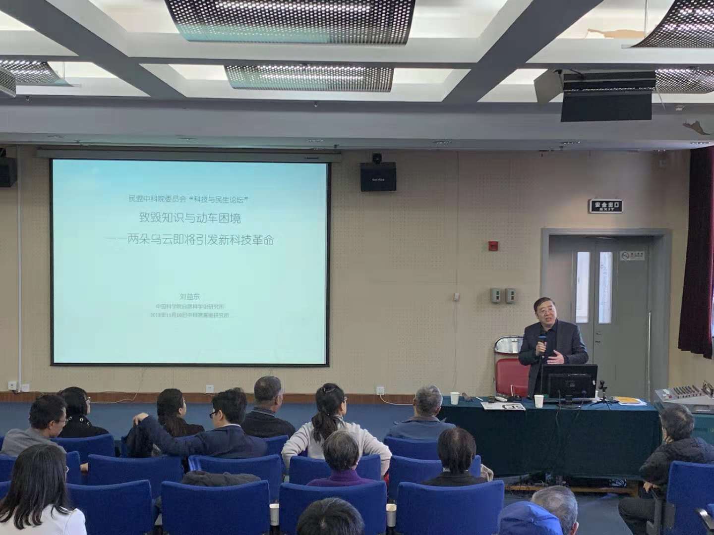 11月16日,由民盟中科院委员会主办的“科技与民生论坛”主题学术报告会“致毁知识与动车困境——两朵乌云即将引发新科技革命”在高能所举行,民盟中国科学院委员会委员、中国科学院自然科学史研究所刘益东研究员主讲。报告会由高能所卢红研究员主持,来自民盟中科院委员会、民盟农业农村部委员会、民盟中央科技委员会代表以及高能所职工和学生参加了本次学术报告,中科院北京分院党建工作处吉顺副处长到会指导。