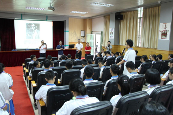 在大朗中学会场,张俊荣研究员借助《小王子》《理想国》等同学们耳熟能详的书籍,为大家讲解物质、能量、空间和时间等物理学概念,和同学们一道领略“物理的星辰和大海”,激发大家对于科学知识的热情。