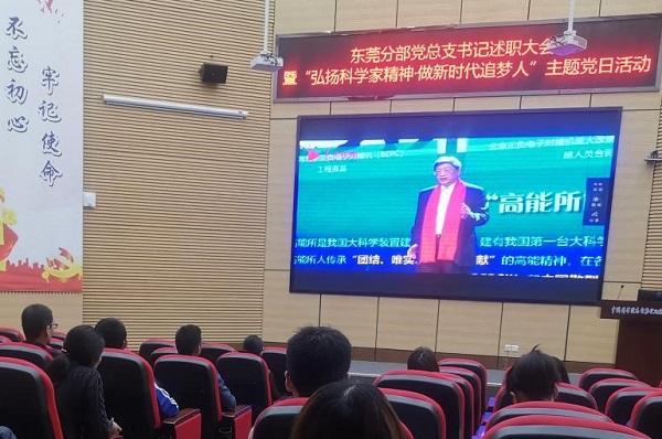 在“弘扬科学家精神·做新时代追梦人”主题党日活动环节,与会党员观看了2019中科院年度人物和年度团队发布会视频,以期通过学习先进典型的动人事迹,弘扬新时代科学家精神,树立良好的作风学风。