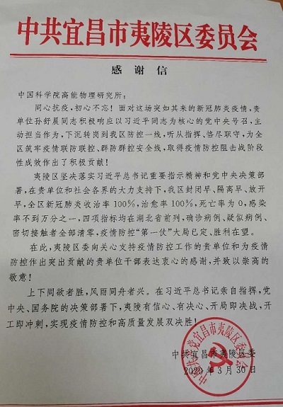 近日,中共宜昌市夷陵区委发来感谢信,信中感谢中科院高能所加速器中心第三党支部党员孙舒晨同志在疫情防控期间积极响应以习近平同志为核心的党中央号召,为取得疫情防控阻击战阶段性成效作出了积极贡献。