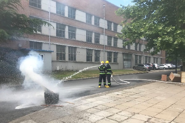 拉练自上午10:00展开,本次拉练假定场景为:物资仓库木材堆放场突发火情,可能造成公共财产较大损失,情况十分危急。现场突发火情后,人员立即拨打5959向所安全中控值班室报告,同时按下了消防手动报警按钮。行政处安保办接到火情报警后,迅速将有关情况向所应急领导小组报告,并依据应急预案,指令微型消防站紧急出动,赶赴现场展开初期灭火处置。拉练结束后,现场拉演人员就本次拉练情况、预案完善和应急处置程序等进行了总结交流。