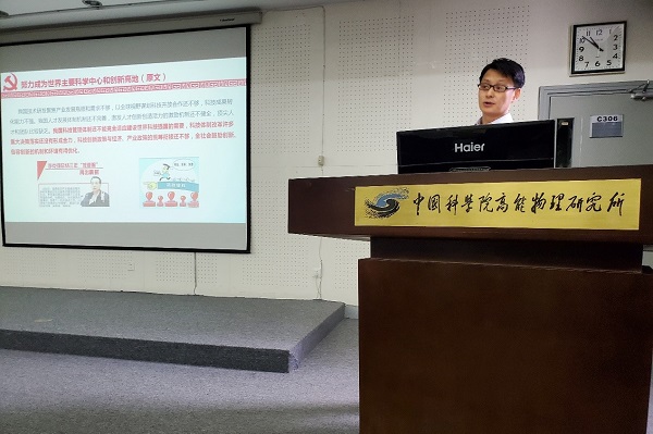 8月20日,中科院高能所党政联合办和科研计划处党支部联合开展主题党日活动,活动邀请党委委员郭立军讲党课,科研计划处党支部组织委员徐鹤主持活动。
