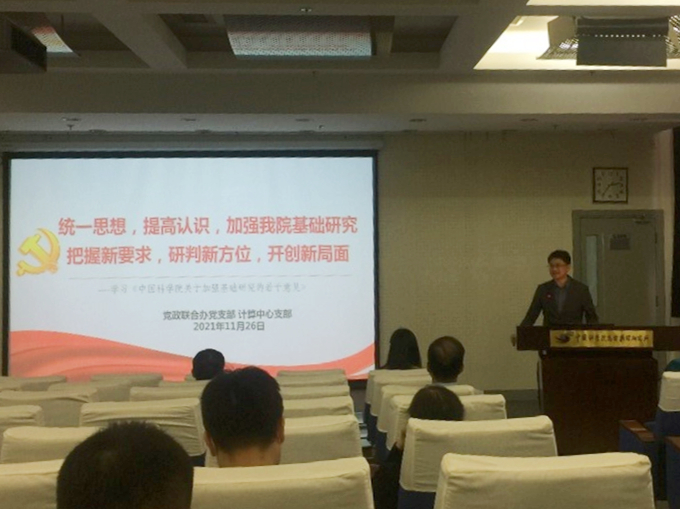 11月26日下午,中科院高能所党政办联合支部与计算中心党支部联合召开主题党日活动。会议主要内容有学习十九届六中全会精神和学习院基础研究十条,会议由支部书记王欢主持。