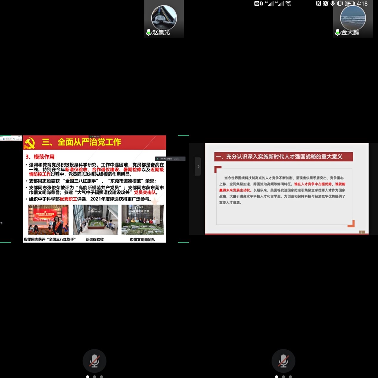 12月22日下午,东莞研究部党总支克服疫情困难,在线召开了第二十三次(扩大)会议,组织开展下属支部党建述职考评暨“勇担科技创新使命”主题党日活动。党总支委员、各党支部书记及研究部党政办有关人员参加了会议。党总支书记金大鹏主持会议。