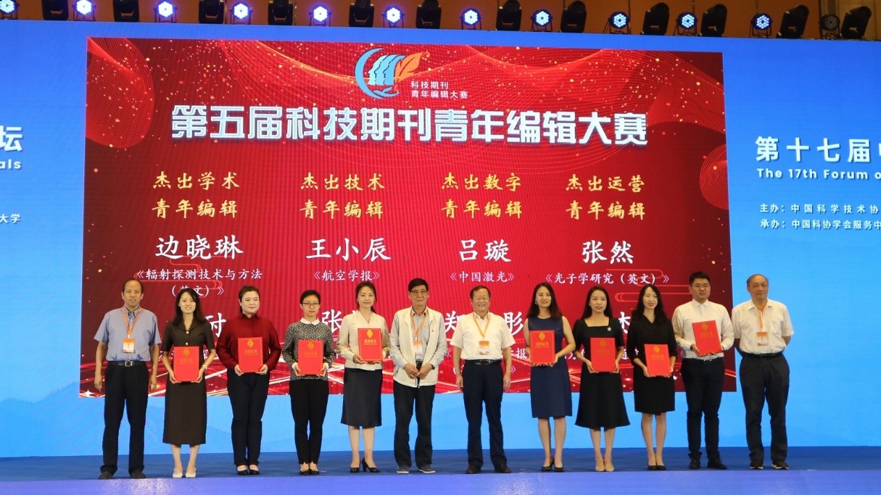 第五届科技期刊青年编辑大赛由中国科协学会服务中心、中国期刊协会、中国科学技术期刊编辑学会、中国高校科技期刊研究会、中国科学院自然科学期刊编辑研究会联合主办,本届大赛共2000余人报名参赛,分为学术编辑、技术编辑、数字编辑及运营人员四个版块分别进行决赛。经过全国网上答题海选、视频展示竞技,最终进入现场巅峰对决环节,在学术编辑版块决赛中,评选出了2名“杰出学术青年编辑”、3名“突出学术青年编辑”、15名“优秀学术青年编辑”。在次日25日举行的第十七届中国科技期刊发展论坛开幕式上,由杨卫院士、郑永飞院士、刘文清院士、杨华勇院士为所有杰出青年编辑颁发了获奖证书。