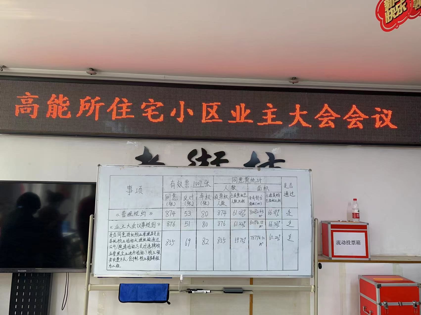 为推进高能所住宅小区社会化管理,根据《北京市物业管理条例》,2020年8月在老山街道指导下物管会成立。今年3月完成物业费评估工作,根据物管会工作安排,2022年8月10日至10月13日,采取书面征求意见的方式组织业主召开了高能所住宅小区业主大会会议,对《高能所住宅小区管理规约》和《高能所住宅小区业主大会议事规则》两个文件,以及是否同意授权物管会委托物业招标代理机构通过公开或邀请招标方式对选聘物业管理企业进行招投标等三个事项进行表决。
