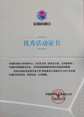 近日,中国科协对2022年全国科普日有关组织单位和活动进行表扬。校园宇宙线观测联盟的校园宇宙线观测活动以及参与的“追逐宇宙之梦 探索星辰大海“活动入选了2022年全国科普日优秀活动。