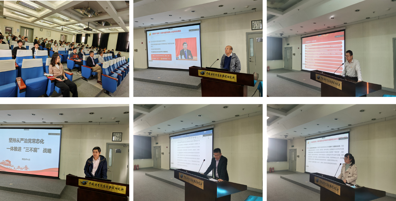 所党委委员王九庆主要介绍了中国共产党第二十届中央委员会第二次全体会议概况,学习宣传贯彻二十大精神的重要性,2023年各项目标任务以及中科院党组对习近平总书记在党的二十届二中全会上的重要讲话和全会精神的传达情况等,同时号召党员继续进行深入学习。总支书记岳军会主要介绍了2023年两会的基本情况、政府工作汇报、党和国家机构改革方案及习近平在参加江苏代表团审议时的讲话等,尤其对于科研工作相关的一些决策部署进行详细说明,包括“深入实施创新驱动发展战略,推动产业结构优化升级”、“科技政策要聚焦自立自强,也要坚持国际合作等”。所纪委委员曹建社主要介绍了二十届中纪委二次会议精神及2023年工作重点,尤其是对身边发生的一些典型案例进行讲解通报,号召广大党员及职工要时刻保持反腐意识,一体认识“不敢腐、不能腐、不想腐”,以自我革命精神反腐败。