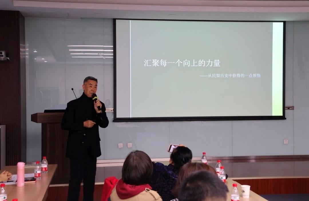读书会上,张冠生老师以《汇聚每一个向上的力量》为题,主讲盟员读书会。他通过查阅历史文献和实地考察获得的珍贵资料,引导在场盟员深入了解民盟先贤的历史,重现了梁漱溟、费孝通、闻一多等前辈们在新中国民主道路建设中的不懈努力与杰出贡献。他鼓励盟员们从身边的小事做起,汇聚每一份向上的力量。