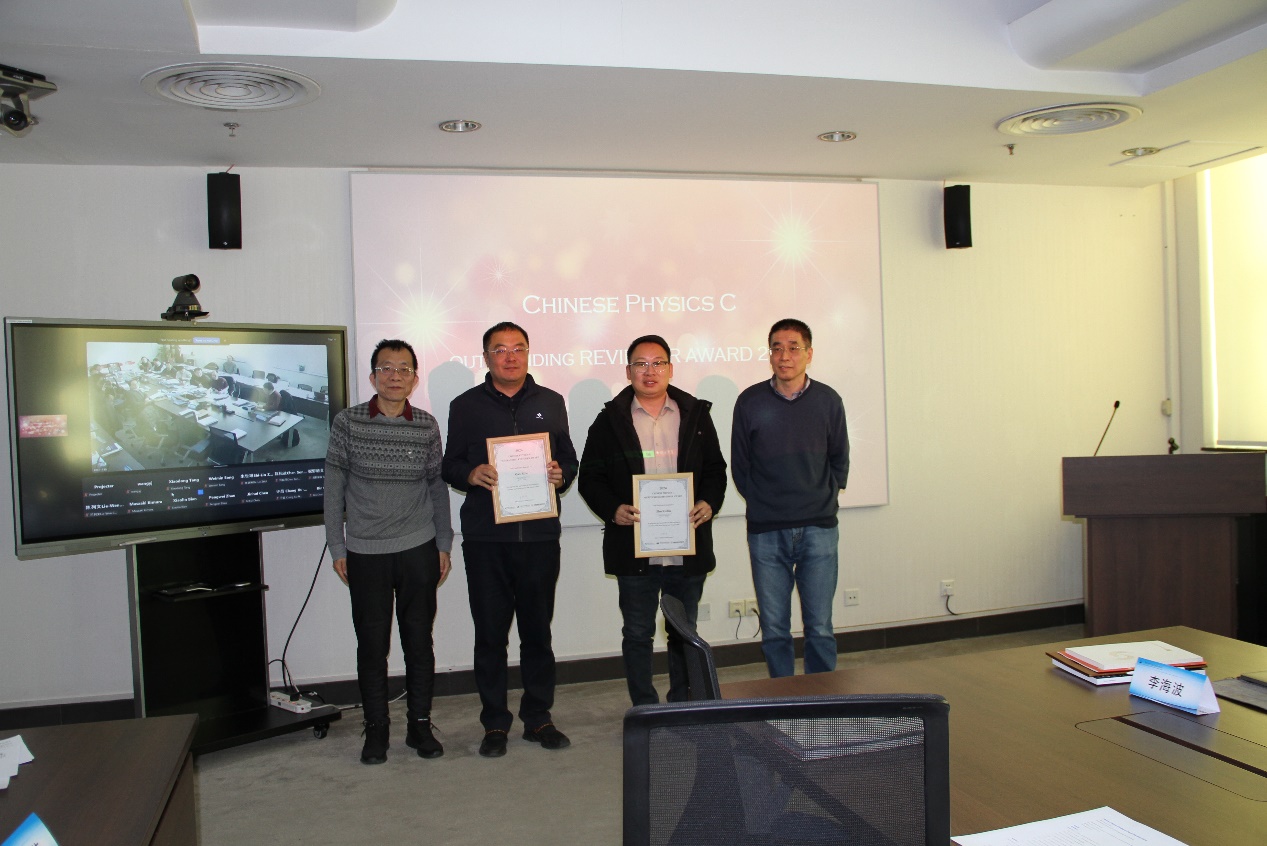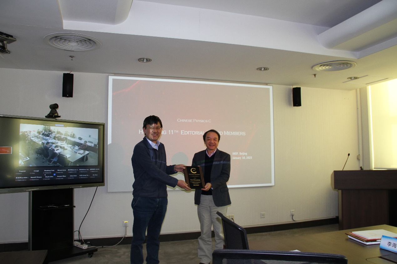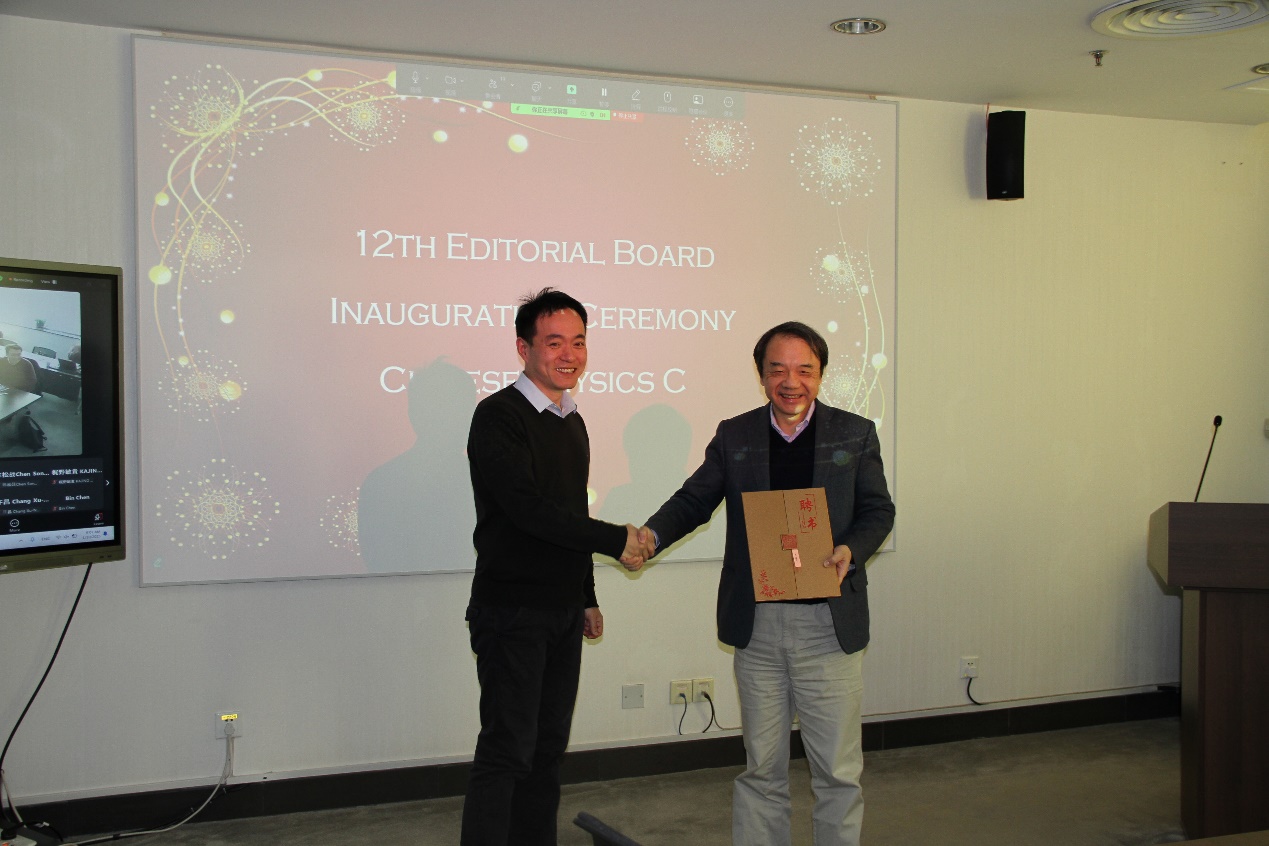会议同时举行了《中国物理C》第十二届编委会就职仪式,李煜辉代表主办单位为主编王贻芳颁发聘书。新一届编委会共61人,按照编委换届流程推选产生,经主办单位批复最终确定。王贻芳向上一届荣退编委代表苑长征颁发编委荣誉证书,并感谢他为期刊发展做出的卓越贡献。