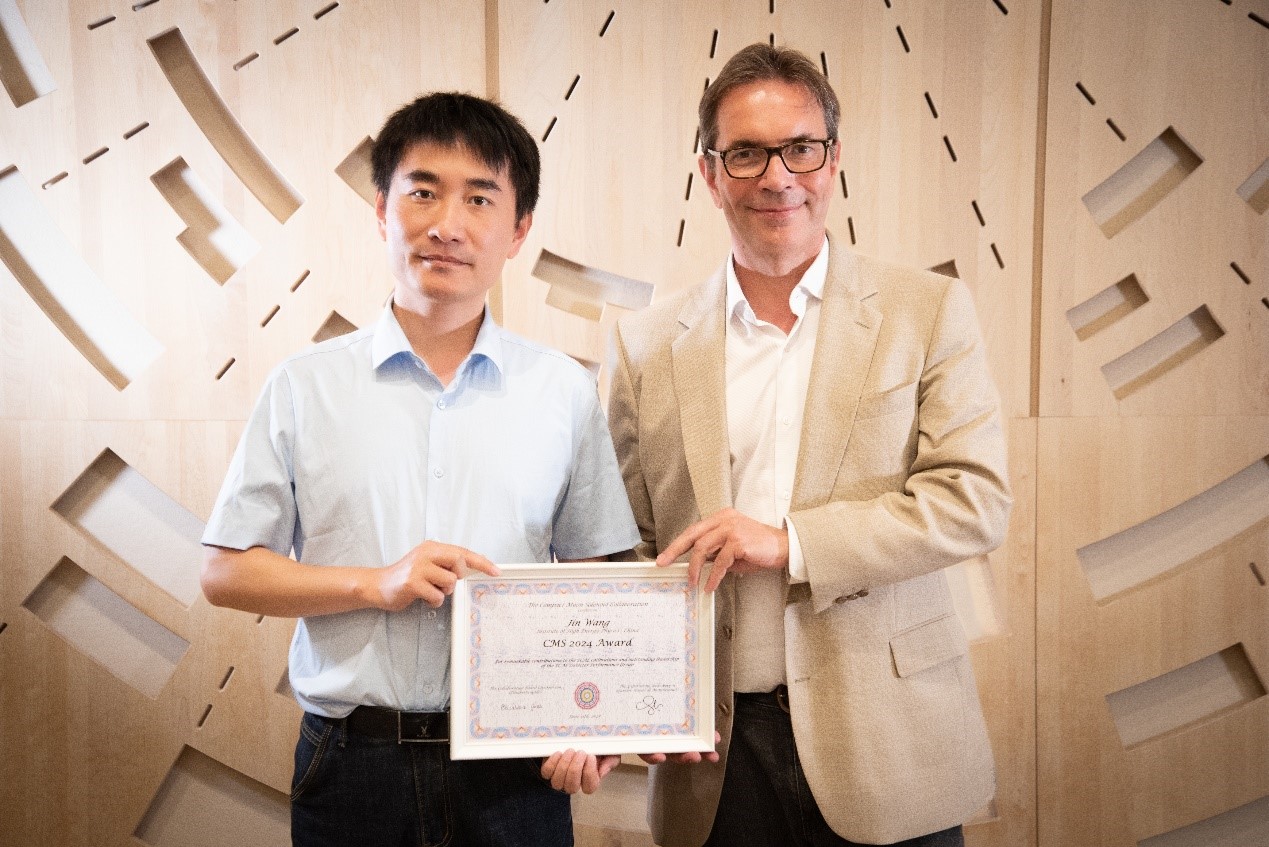 图1:王锦副研究员(左)在CMS Week颁奖仪式上接受CMS现任发言人Gautier Hamel de Monchenault(右)颁发2024年度CMS Award。奖状授奖理由为:“For remarkable contributions to the ECAL calibrations and outstanding leadership of the ECAL Detector Performance Group.”