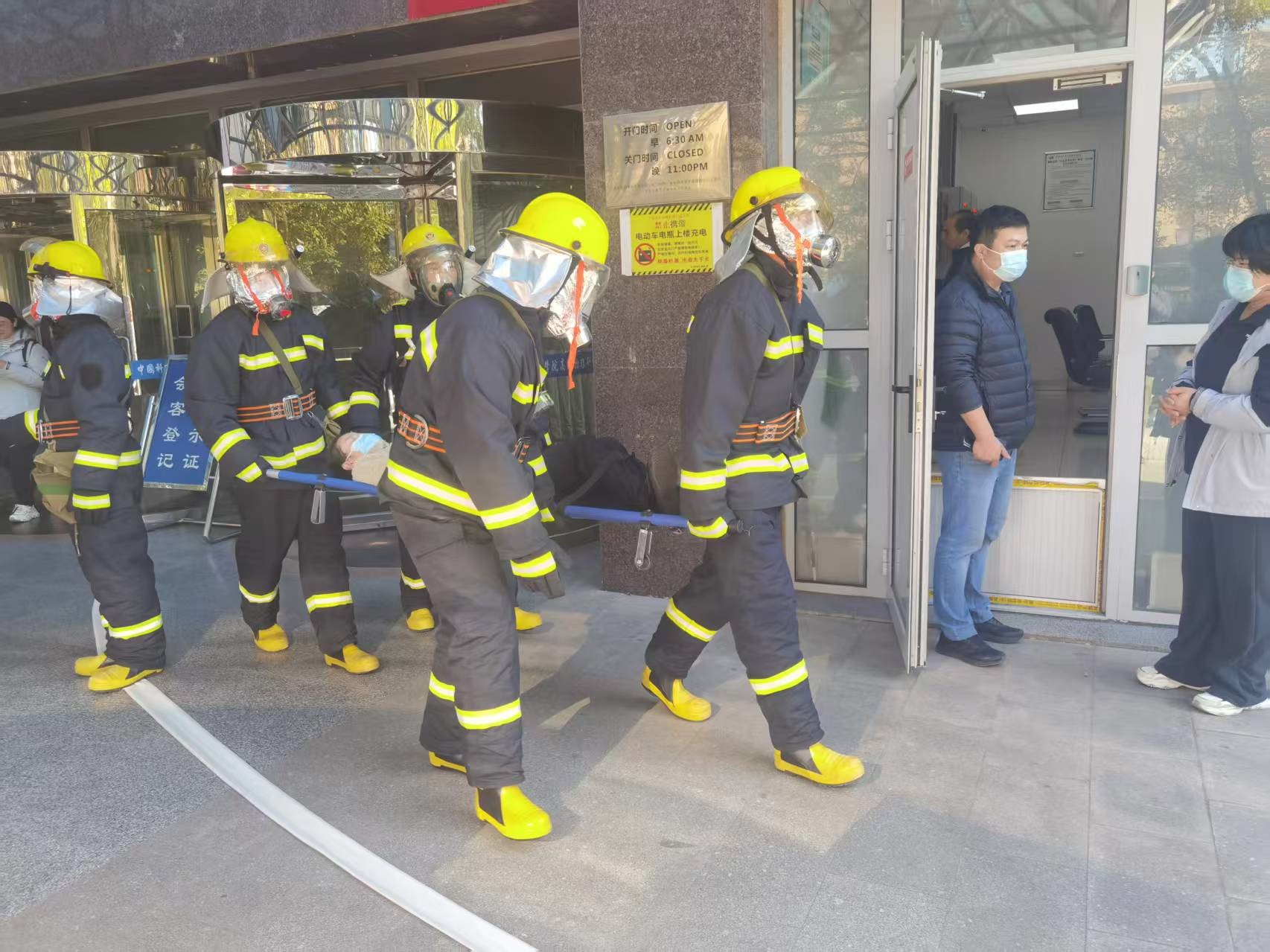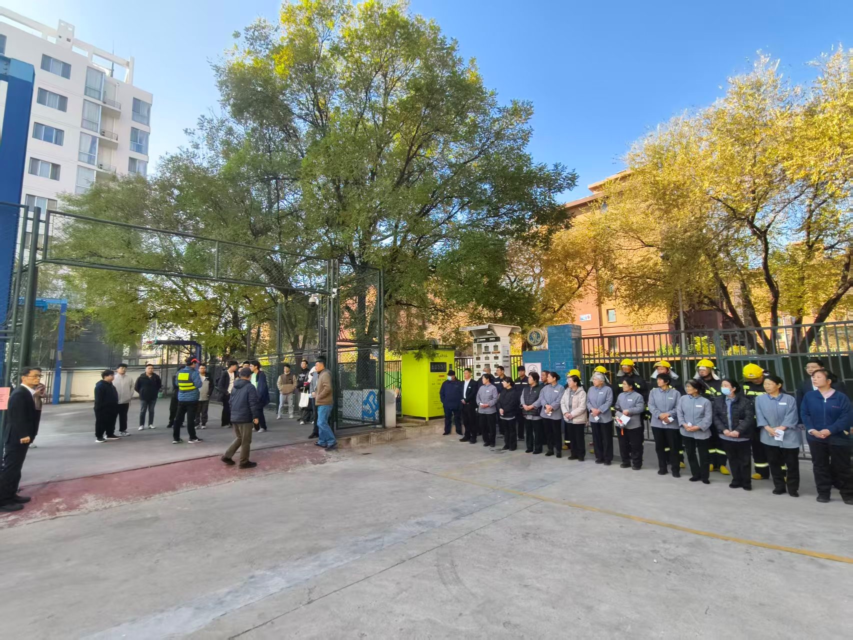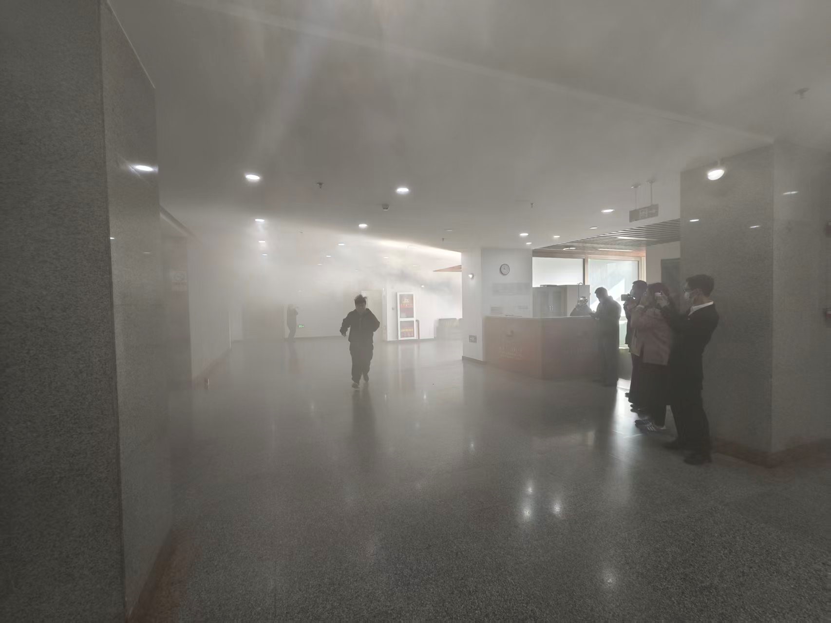 此次演习是高能所在去年演练基础上的升级优化,突出“实战化、全流程、广覆盖”特点。演习模拟三公寓突发火情,通过发烟罐释放大量烟雾还原真实火灾场景,触发消防设施启动,部分人员被困。值班人员发现“火情”后,按程序立即启动《灭火和疏散救援预案》,应急处置各组同步响应:指挥组第一时间抵达现场统筹调度,灭火组启用消防水源开展“出真水”“灭真火”扑救,疏散组按照预定路线有序引导人员撤离并逐一点名核对,救援组利用担架快速转移伤员,医疗组现场实施心肺复苏等急救操作,引导组则精准指引消防车就位增援。整个演习过程紧张有序、衔接顺畅,圆满完成各项预设任务,达到了以演促练、以练筑防的预期目标。