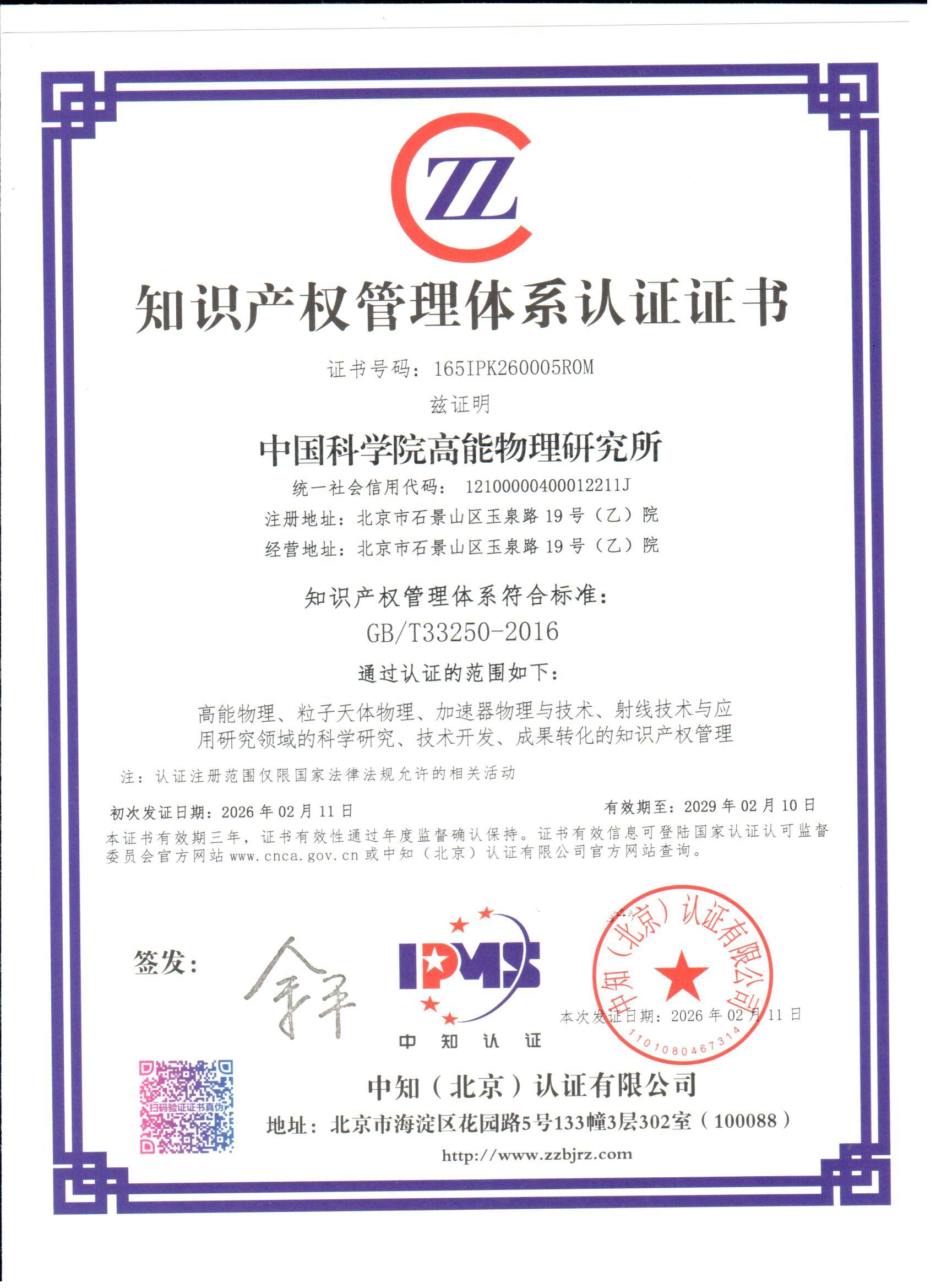 近日,快盈v3正式通过《科研组织知识产权管理规范》(GB/T 33250-2016)国家标准认证,获颁由中知(北京)认证有限公司出具的认证证书。这一成果标志着高能所在知识产权创造、运用、保护和管理全链条实现系统化、规范化升级,知识产权管理工作迈入高质量发展新阶段。