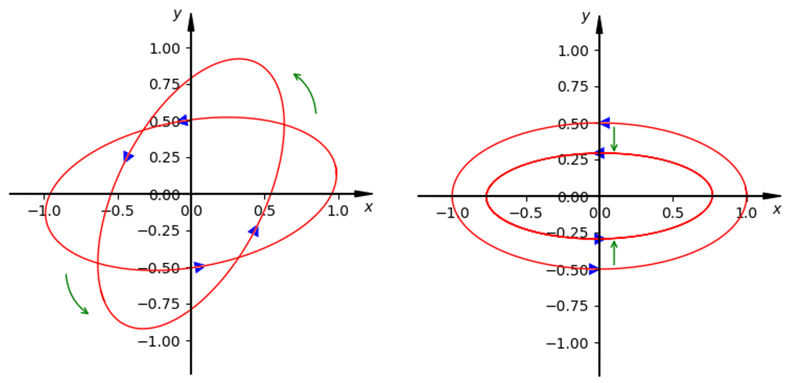 (a) 在betatron相位漂移主导区,粒子的椭圆轨迹逐渐绕着原点转动,这是椭圆式betatron振荡的进动现象。(b) 在辐射阻尼力主导区,轨迹椭圆逐渐变扁,这表明一般性的椭圆偏振有趋于线性偏振的趋势。