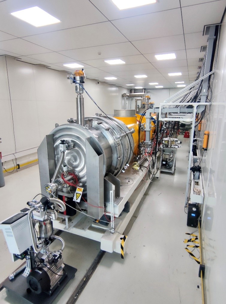高能所项目团队在潘卫民研究员的带领下,继2020年在国际上首次改进中温退火工艺并成功实现1.3 GHz 9-cell超导腔的中温退火工艺之后,为满足国家战略需求,坚持自主创新,瞄准国际最高水平全力攻坚,实现了比掺氮工艺更为先进的中温退火高品质因数超导腔模组技术路线,创造了超导加速器品质因数的世界纪录,满足了我国相关大科学工程的迫切需求。模组高功率水平测试显示:模组总腔压133 MV时,2 K总热负荷80 W,8只1.3 GHz 9-cell超导腔的平均加速梯度16.1 MV/m、平均品质因数3.8×1010。模组总腔压174 MV时,2 K总热负荷122 W,平均加速梯度21 MV/m,平均品质因数3.75×1010。模组稳定运行总腔压大于191 MV,平均加速梯度达到23 MV/m以上。