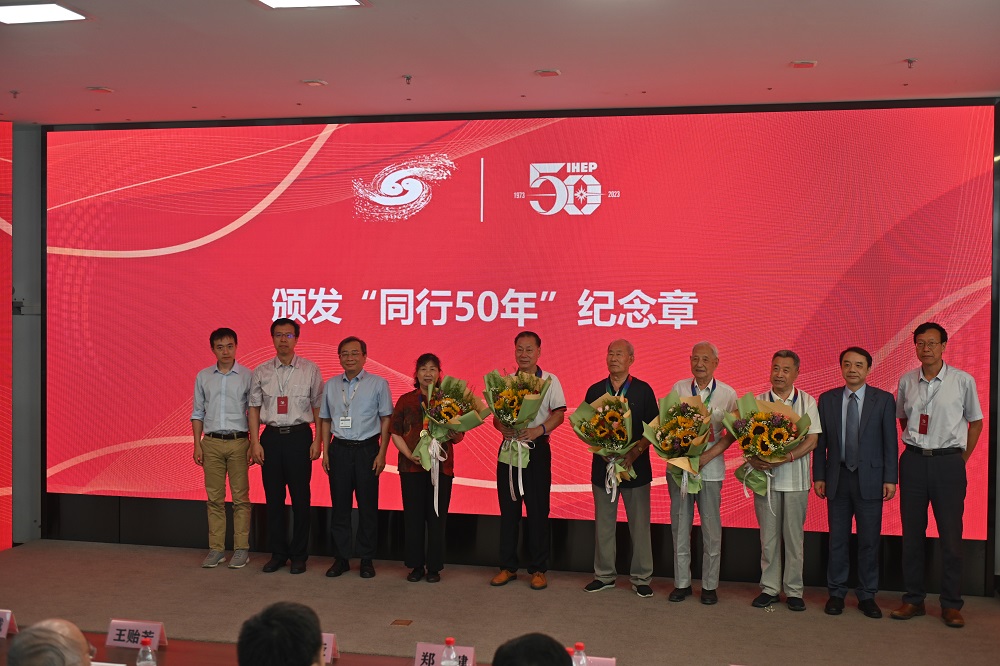 高能所张闯研究员、何苗研究员、李木槿博士作为老中青三位代表向大会发表感言,大会向李金、崔化传、蔡宽、谢永红、王齐望等5位老前辈代表(共186位)颁发了“同行50年”纪念章。