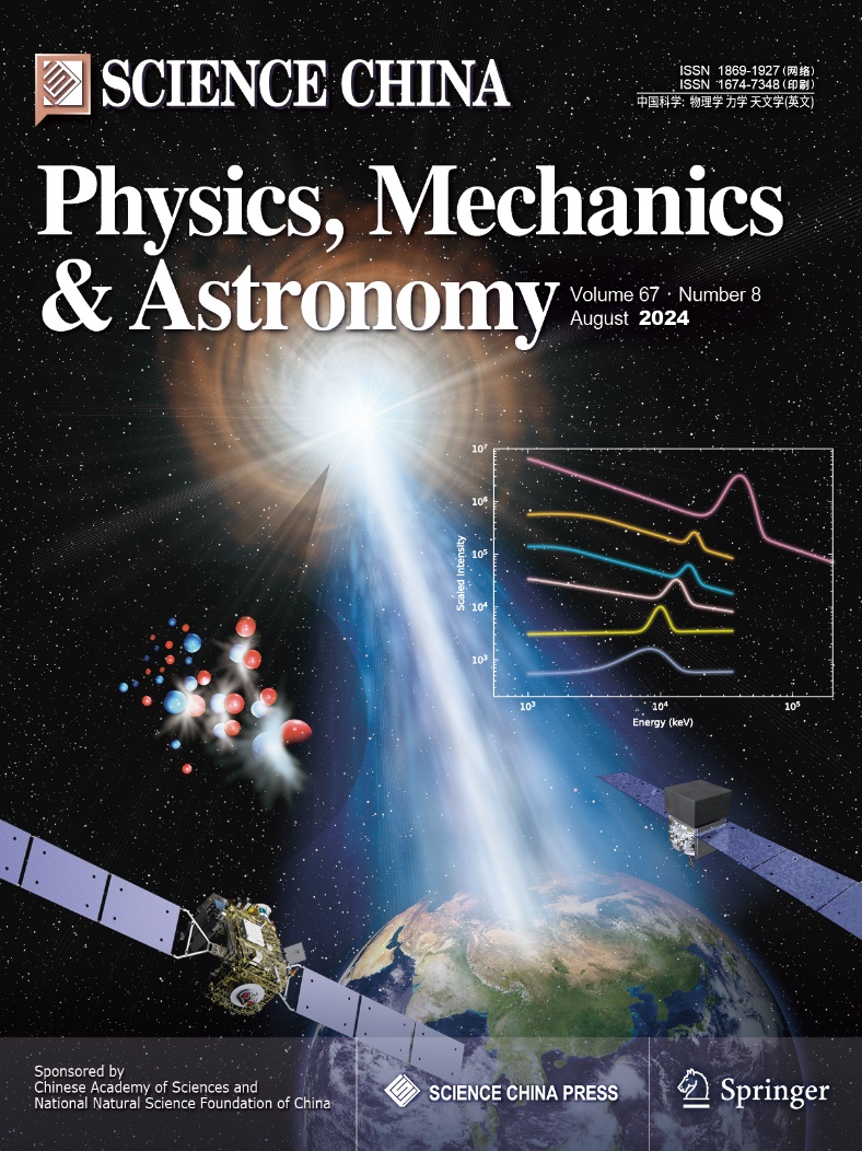 图1:本项研究成果以封面论文形式发表在《中国科学:物理学 力学 天文学》(英文版)。图片展现了极目空间望远镜和费米卫星观测迄今最亮伽马暴,并联合发现随时间演化的伽马射线谱线的情况。