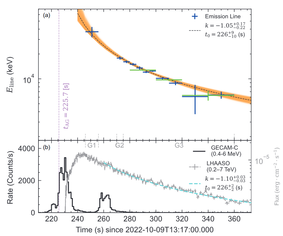 经过严谨分析,研究团队发现该伽马暴的能谱中存在一条演化规律的发射线谱线,谱线的能量和光度均随时间以幂律演化,为谱线的真实性以及谱线起源于该伽马暴提供了最坚实的证据。此外,研究团队还发现谱线的相对展宽较窄(仅10%左右)且基本不随时间变化。令人更意外的是,在伽马暴主暴阶段谱线能量高达37兆电子伏,这是迄今探测到的宇宙天体产生的最高能量的谱线。这些发现对于研究伽马暴及相对论性喷流的物理性质和产生机制具有重要而独特价值,是伽马暴和极端宇宙观测研究的重大突破。