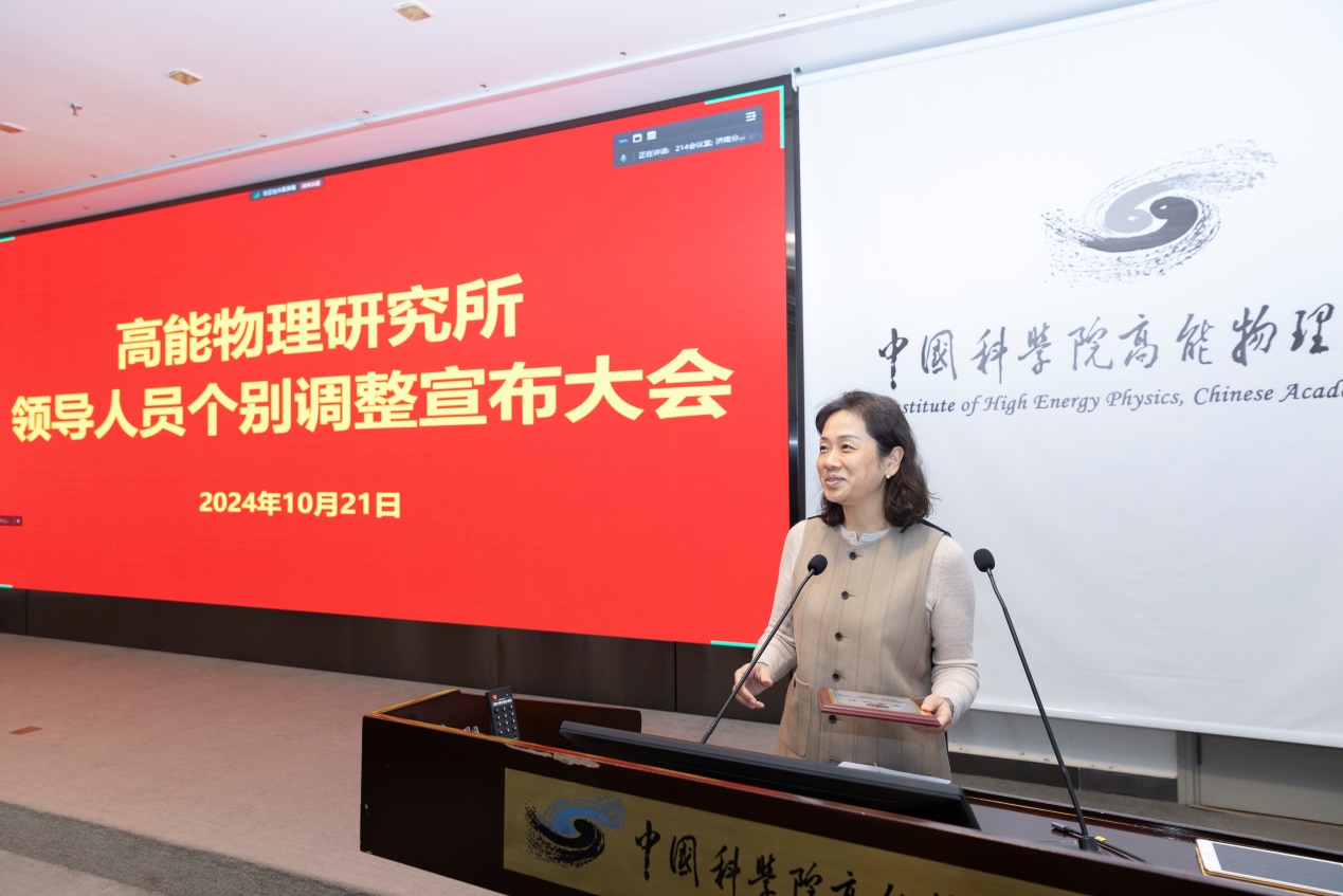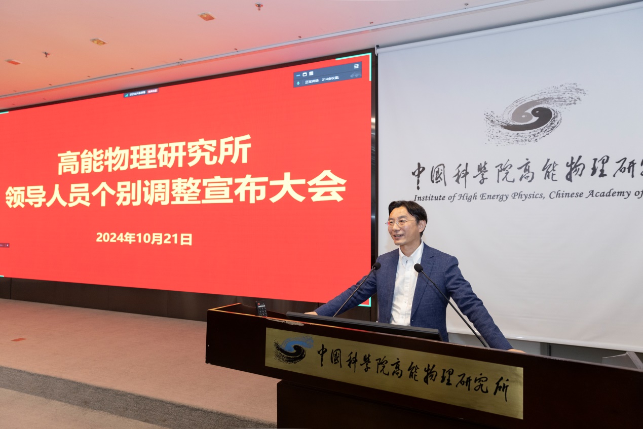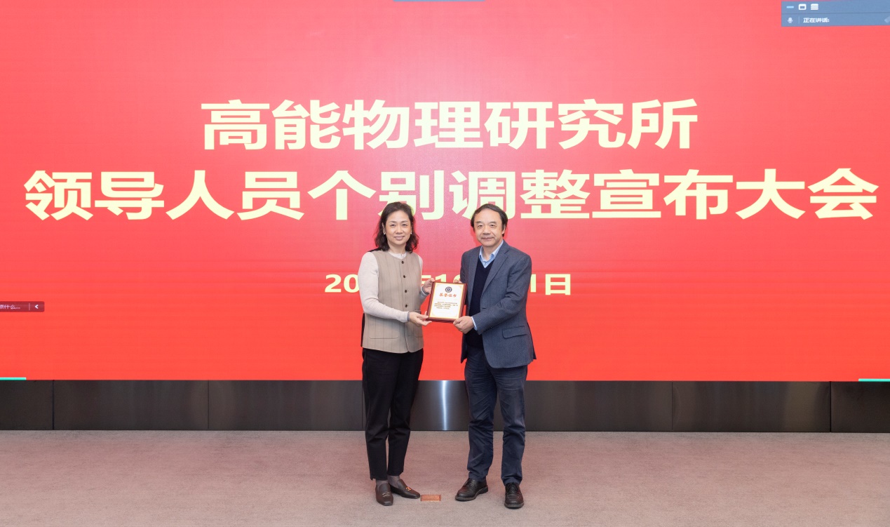蔡宏志宣读了中共中国科学院党组关于曹俊、王贻芳同志职务任免的通知:曹俊同志任高能物理研究所所长(试用期一年);免去王贻芳同志高能物理研究所所长职务,保留正局级。