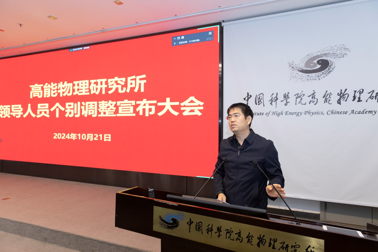 10月21日下午,高能所召开所领导人员个别调整宣布大会,中国科学院副秘书长、人事局局长孙晓明出席会议。中国科学院人事局副局长蔡宏志主持会议。高能所现任领导班子成员、新近离任的领导班子成员;院士;党委委员、纪委委员;学术委员会正副职;研究室正副职,正高级专业技术人员;管理、支撑部门正副职;工会委员会委员;党支部书记等200余人参加会议。东莞研究部、济南研究部设立视频分会场。