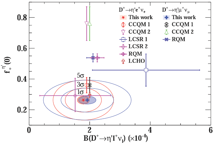 图1. D+→η'强子跃迁形状因子和半轻跃迁分支比测量结果与理论计算的比较