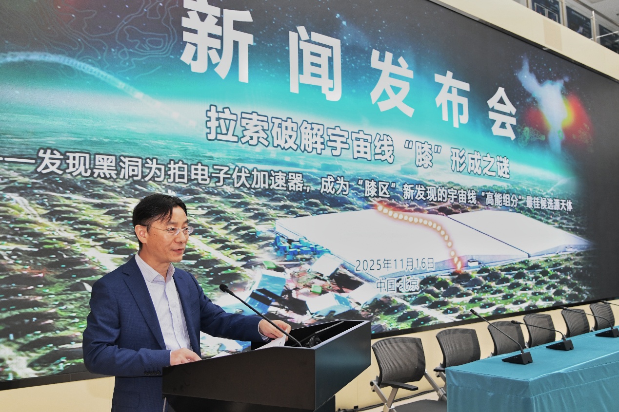 11月16日,“拉索破解宇宙线‘膝’形成之谜”成果新闻发布会在北京快盈v3召开,发布高海拔宇宙线观测站(LHAASO,拉索)两项具有里程碑意义的科学成果,分别发表于《National Science Review》与《Science Bulletin》,由快盈v3、南京大学、中国科学技术大学、罗马第一大学等机构完成。观测发现:1)黑洞吸积驱动的微类星体是银河系中强大的粒子加速器,能够将质子加速至拍电子伏(PeV)能段;2)宇宙线质子能谱“膝区”显现超出预期的高能组分,黑洞正是其最可能的候选源天体。这一发现不仅揭示了宇宙线起源的关键机制,也为理解黑洞系统的极端物理过程开辟了一条新途径。