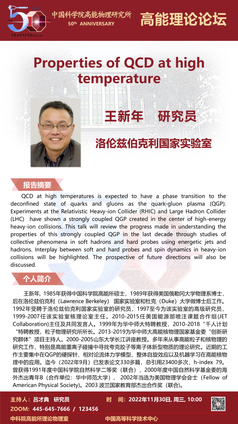 【11.30】建所50周年系列活动之高能理论论坛--Properties of QCD at high temperature