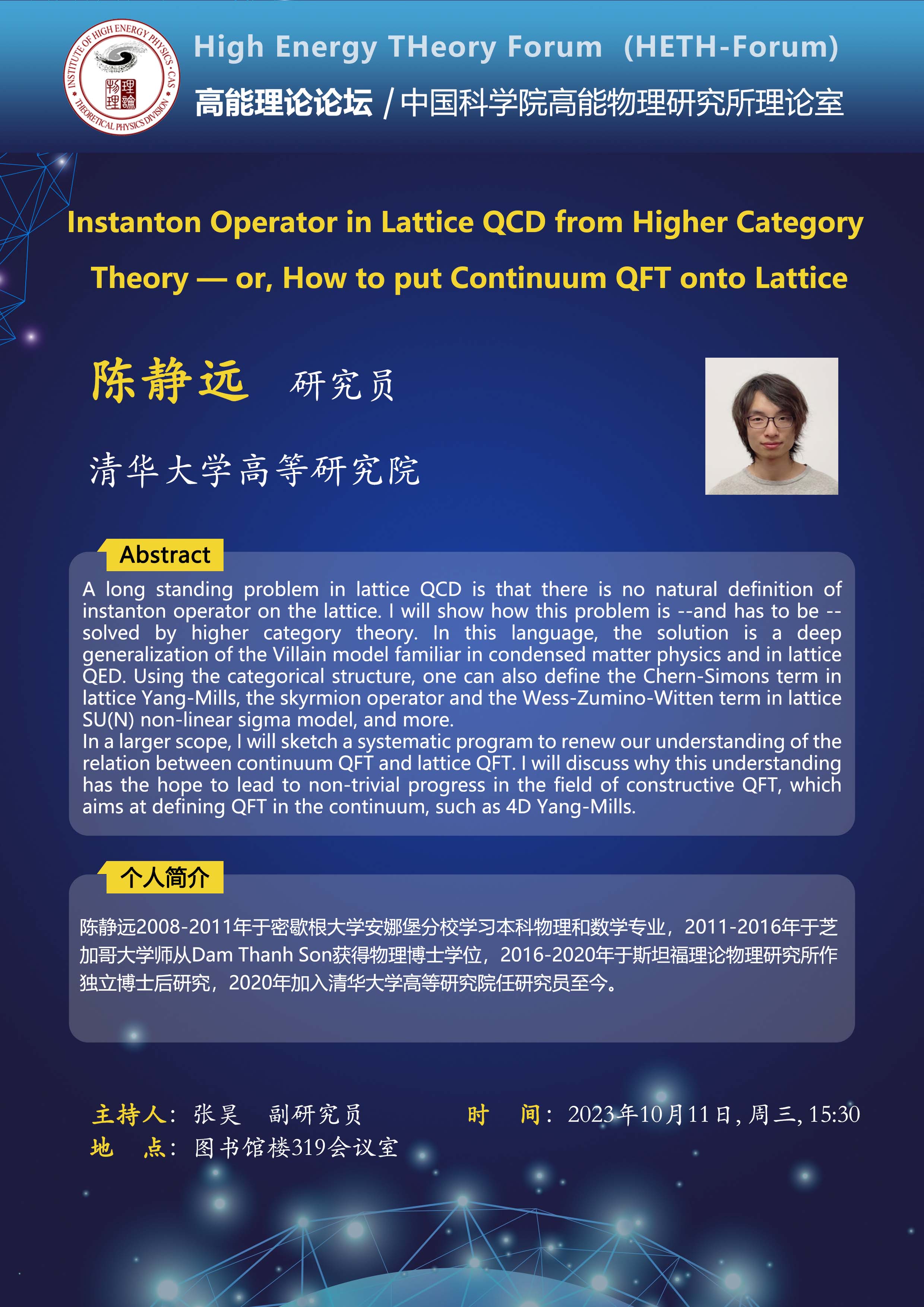 【10.11】高能理论论坛第55期--Instanton Operator in Lattice QCD from Higher Category Theory — or, How to put Continuum QFT onto Lattice