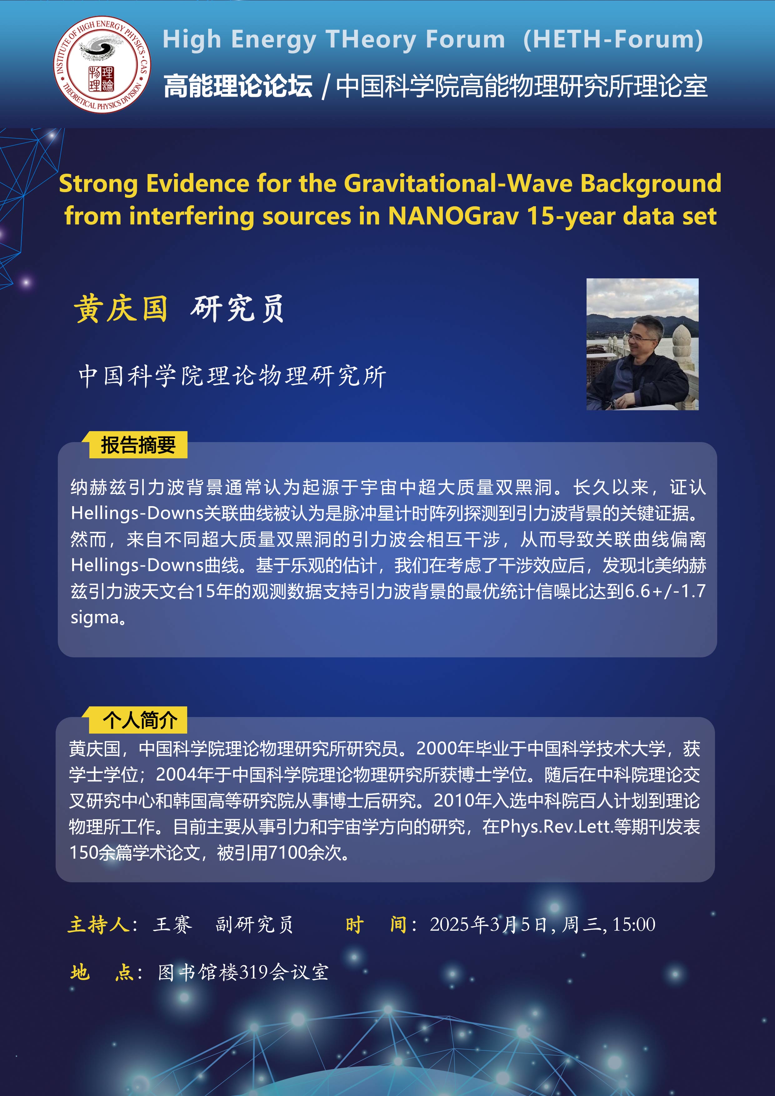 【03.05】高能理论论坛第90期--Strong Evidence for the Gravitational-Wave Background from interfering sources in NANOGrav 15-year data set