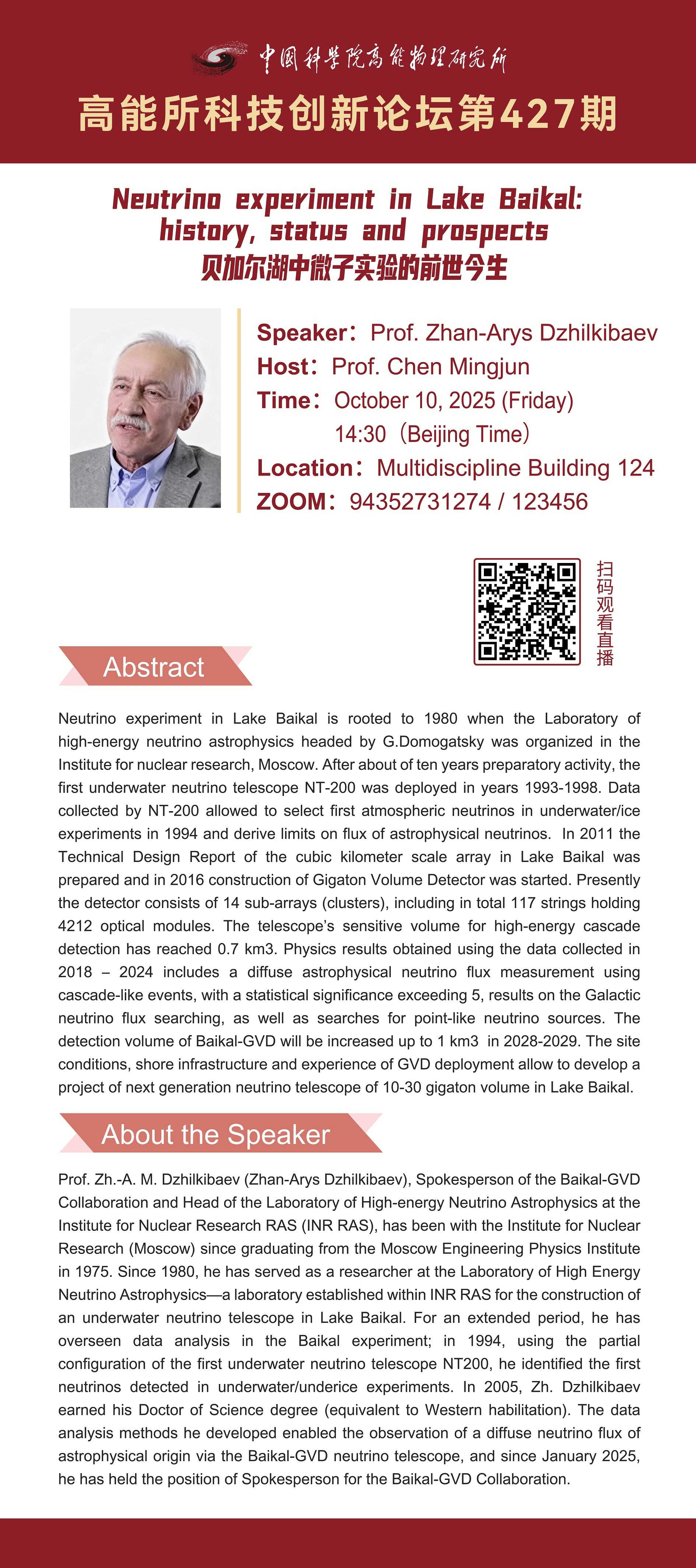 【10.10】高能所科技创新论坛(427)Neutrino experiment in Lake Baikal: history, status and prospects(贝加尔湖中微子实验的前世今生)