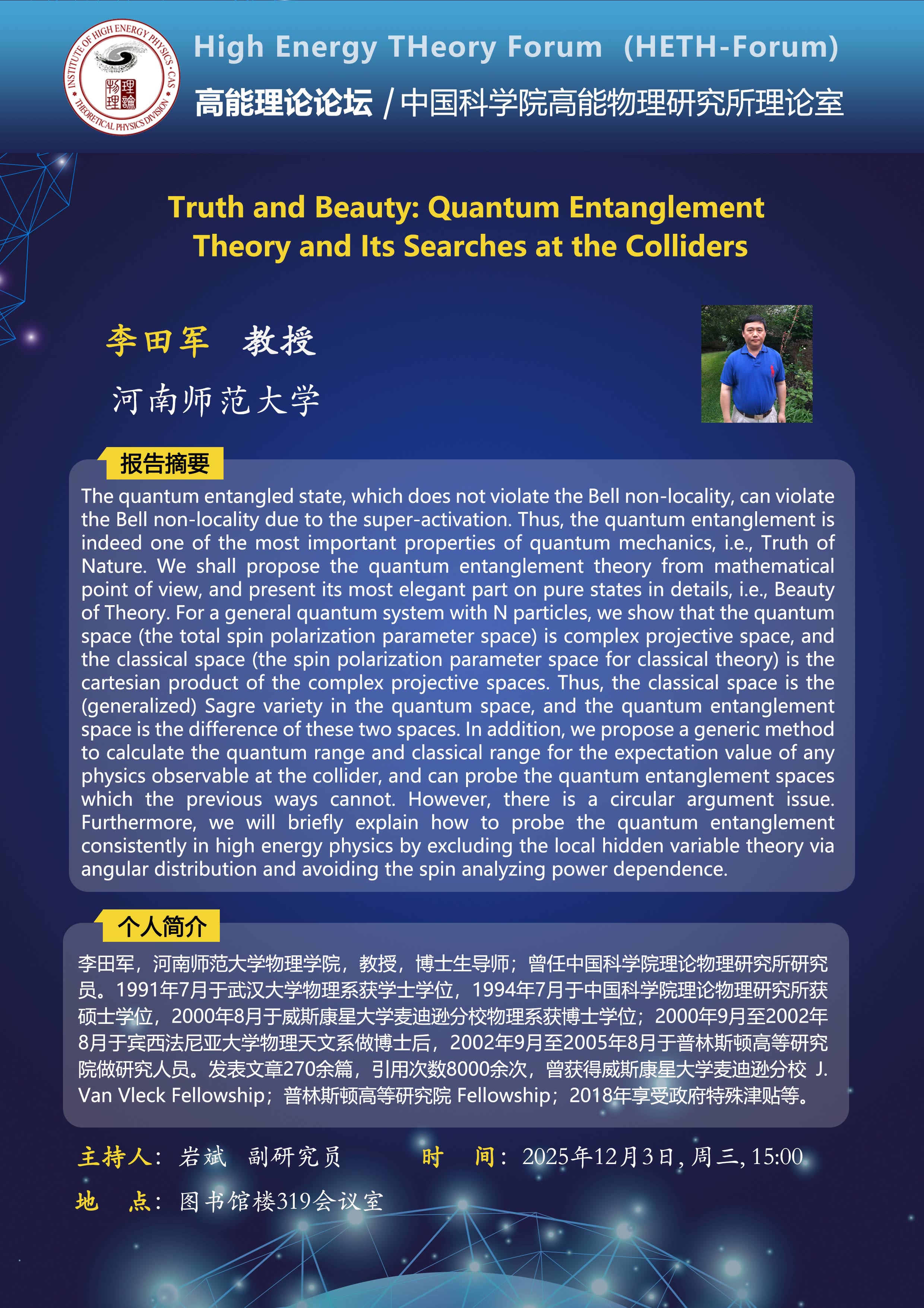 【12.03】高能理论论坛第114期--Truth and Beauty: Quantum Entanglement Theory and Its Searches at the Colliders