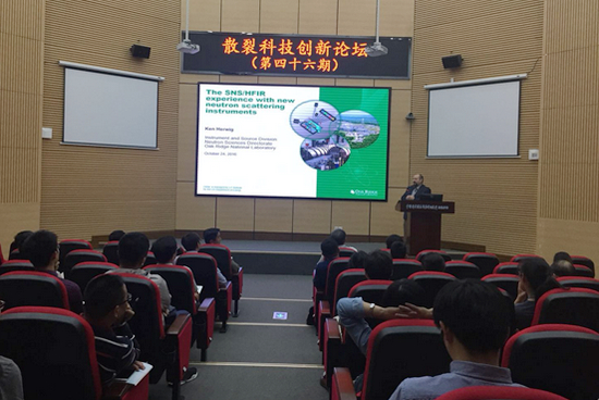 10月24日上午,美国散裂中子源(SNS)的Kenneth W.Herwig 教授和日本散裂中子源(J-PARC)的Toshiya Otomo 教授应邀访问中国散裂中子源(CSNS)并到散裂科技创新论坛做报告。报告会由CSNS工程经理陈和生院士主持,高能所东莞分部领导和各部门领导在内的100多位科研人员听取了报告。