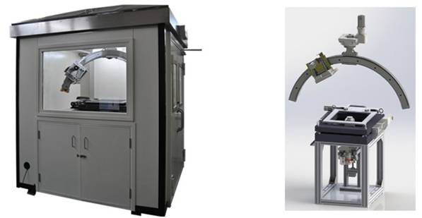 显微CL是针对板状物体设计的专用三维成像仪器。下图是显微CL系统的结构示意图。扫描时,将板状物体放置在二维平台上,探测器随C型臂转动,射线始终保持从倾斜的方向入射到板状物体上。由于倾斜扫描,显微CL损失了一部分的数据完备性,但是避免了前面提到的板状物显微CT成像的两个困难。