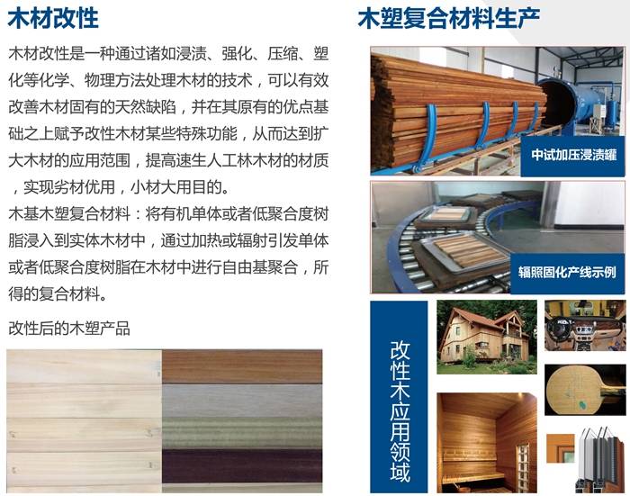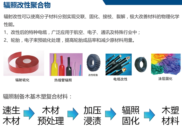 材料:涂层固化、聚合物改性、复合材料制备;辐射技术在高分子材料领域,主要有辐射交联、辐射固化、辐射硫化、辐射降解、辐射接枝改性等应用。电子束辐射的高穿透性,能使得高分子內部均匀有效的发生反应,从而改善材料性能。