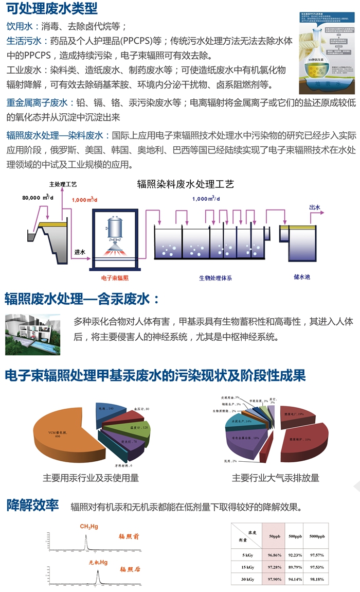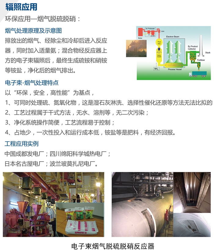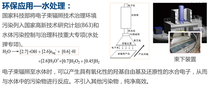 环保:环境“三废”;辐射技术可以有效处理“三废”(废水、废气、废渣),如烟道气脱硫脱硝、去除挥发性有机物、各类型废水处理、处理污泥以减少致病微生物有机体、固体废弃物处理等,与传统方法比,具有效率高、可变废为宝、操作简便等优点。