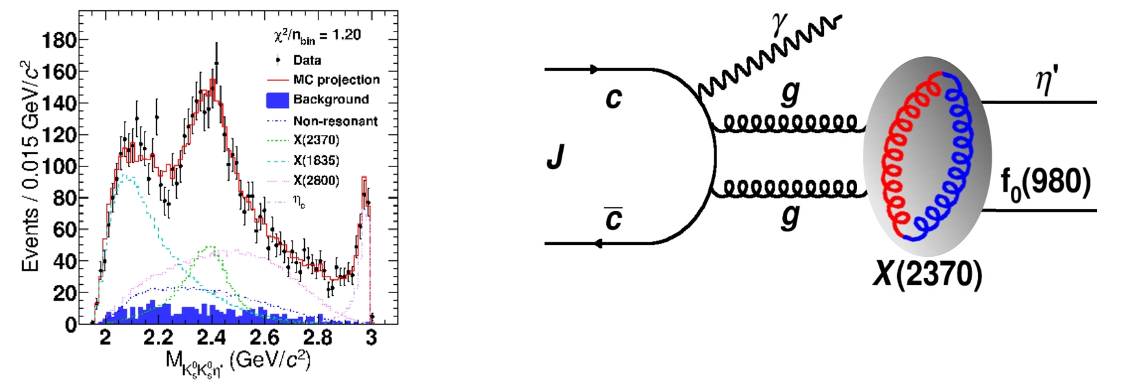 上图为BESIII实验在中在J/ψ→γKS0KS0η' 质量谱上中X(2370)粒子和胶球产生示意图量子数测定