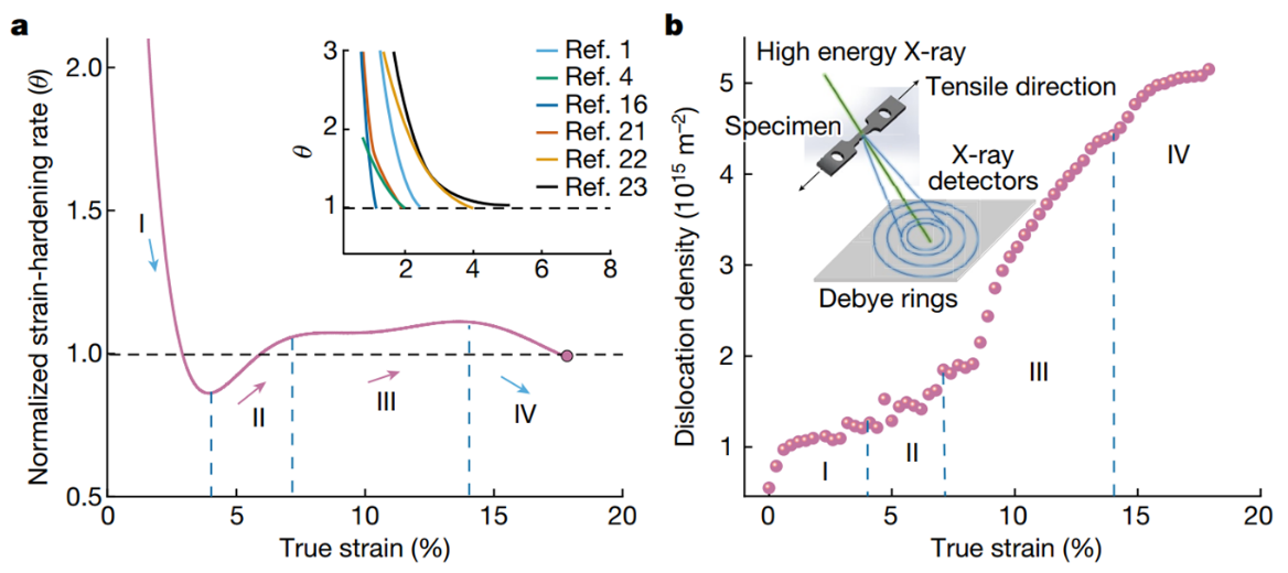 图1. 拉伸时的归一化应变硬化率和同步辐射高能衍射方法计算的位错密度