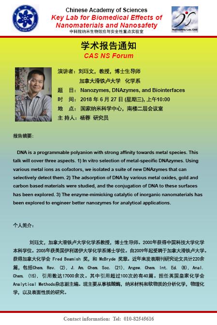 中科院纳米生物效应与安全性重点实验室纳米技术论坛(NS Forum No. 296)第296期学术报告会通知 题 目:Nanozymes, DNAzymes, and Biointerfaces 报告人:刘珏文 教授, 加拿大滑铁卢大学 时 间:2018年6月27日(星期三), 上午10:00 地 点:国家纳米科学中心,南楼二层会议室 主持人:杨蓉 研究员 点击图片下载海报