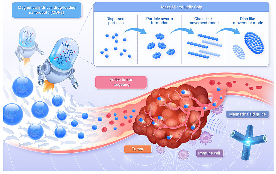 在复杂流体环境中,该纳米机器人系统展现出卓越的环境适应性。通过模拟野生鲱鱼群的集群运动行为,可实现群体分散、队列重组、漩涡形成及定向迁移等动态运动模式,有效突破肿瘤组织的生理屏障。基于物理靶向与精确定位,纳米机器人能够实现肿瘤部位的特异性富集,相较于传统递送方式,药物递送效率实现数量级提升