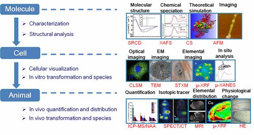 本综述文章系统地总结了先进核分析技术在纳米材料表征、纳米-生物界面结构分析、纳米材料在细胞内的可视化研究、纳米材料在生物体内的分布、蓄积与转化等方面的应用。文章指出,基于新一代先进同步光源技术的新型高通量、高灵敏度、低检测限的核分析技术可为研究纳米材料在生物体内的分布、成像、结构分析、生物指示物的分子机制等纳米毒理学研究提供强有力地支持。阐明纳米材料与生物体系相互作用的机制,对理解纳米颗粒的生物毒性以及设计安全的纳米材料具有重要意义,为保障我国纳米科技的可持续、健康和快速发展奠定了重要基础。