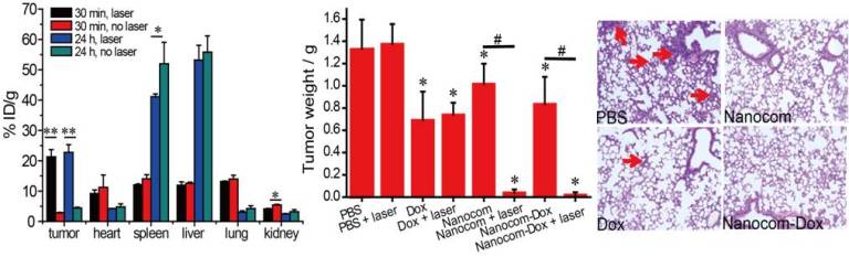 图2. 纳米复合物在激光照射下显著富集于肿瘤组织,其产生的热化疗协同效应,有效抑制了肿瘤的生长与转移