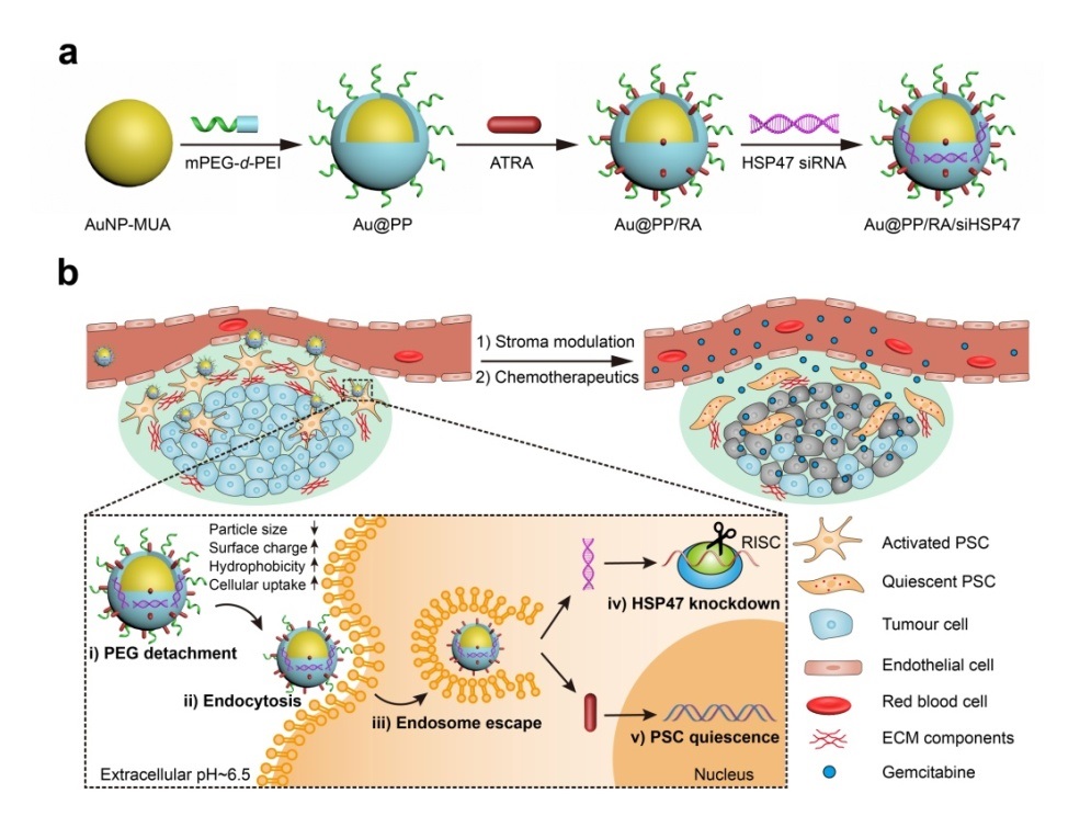 胰腺癌恶性程度高、预后极差,被称为“癌中之王”。胰腺癌微环境具有高度纤维化、过度结缔组织增生及严重乏血供等特殊病理特点,极大地阻碍了临床一线化疗方案的有效实施。激活的PSC大量分泌胶原、纤连蛋白以及基质金属蛋白酶等细胞外基质,是胰腺癌微环境基质的主要来源;并通过与胰腺癌细胞共同构建的调控网络,在胰腺癌发展、转移、耐药和免疫逃逸等方面发挥促进作用,是胰腺癌微环境调控的重要靶点。该工作构建了一种表面修饰聚乙二醇的阳离子金纳米体系,同时递送PSC调控药物及降低基质分泌的siRNA。体系设计中引入了肿瘤微环境低pH响应的聚乙二醇脱除机制,能够在保证其体内输运稳定性的同时,提高癌细胞的药物摄取和siRNA的转染效率。在胰腺癌患者来源的PSC中,该纳米体系能够促进活化的PSC重返静息状态,从而抑制其分泌多种细胞外基质,在胰腺癌细胞/PSC共接种的小鼠胰腺癌皮下肿瘤和原位肿瘤模型中,该纳米体系均实现了对PSC异常活化状态的高效逆转;通过对微环境基质代谢的综合调控,显著增加药物在肿瘤内的输运效率,提高胰腺癌的化疗效果。该研究利用纳米药物体系实现了基于PSC静息的胰腺癌微环境稳态调控,为更广泛的基质纤维化肿瘤的治疗提供了新的思路。