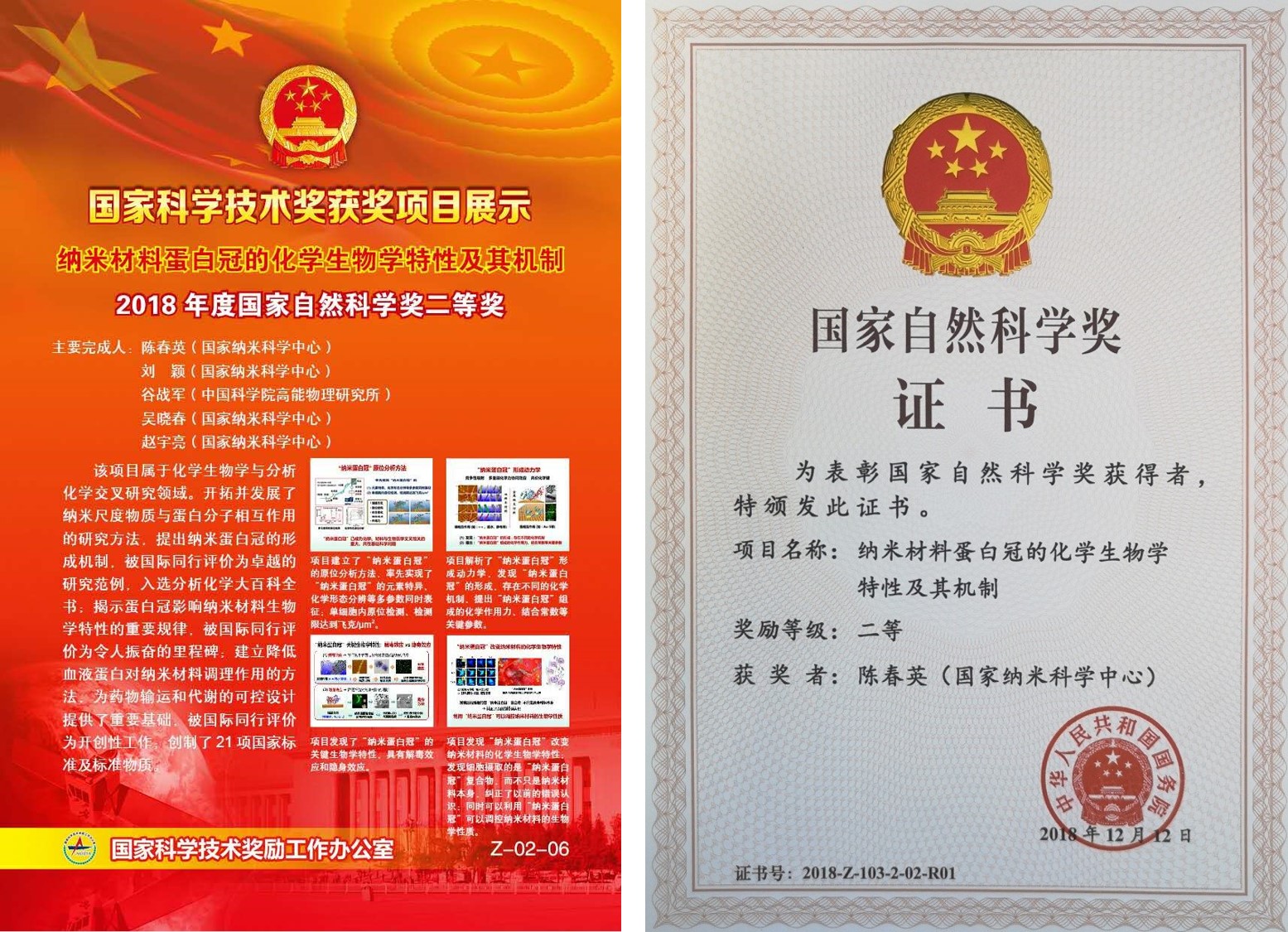 2019年1月8日上午,2018年度国家科学技术奖励大会在北京人民大会堂举行。由国家纳米科学中心陈春英研究员领衔完成的成果“纳米材料蛋白冠的化学生物学特性及其机制”荣获国家自然科学二等奖,实现了国家纳米科学中心成立以来国家自然科学奖零的突破。