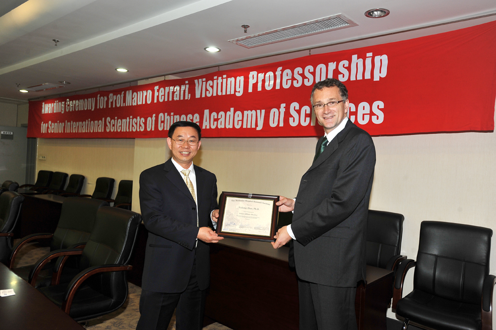 2011年2月,我实验室主任赵宇亮研究员被聘为美国卫理公会医院研究院兼职教授。5月30日美国卫理公会医院研究所(The Methodist Hospital Research Institute)所长Mauro Ferrari教授访问我实验室时为赵宇亮研究员颁发兼职教授聘书,与此同时,Mauro Ferrari教授也被聘为"中国科学院外国专家特聘研究员",这将进一步推动双方在肿瘤纳米技术和学生培养、人才交流等方面的合作。